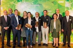 Due to the outstanding quality of the contributions the first prize was split. Dr. Tanja Busse from WDR (German broadcasting corporation) with her contribution "Landwirtschaft und ihre Folgen" (Agriculture and its consequences) as well as Dr. Ute Scheub together with Stefan Schwarzer for their book "Die Humusrevolution" (The humus revolution) shared this prize. The prize for young journalists was awarded by Mascha Kauka, former publisher and founder of the foundation AMAZONICA, to the journalists Johannes Gerding and Caspar Schlenk for their series of articles "Bio am Limit" (Bio at the limit). Dr. Katharina Reuter, managing director of UnternehmensGrün e.V., held the laudation for the winners of the special prize Monika Götze and Marcus Franken with their book "Einfach öko" (Simply eco).
